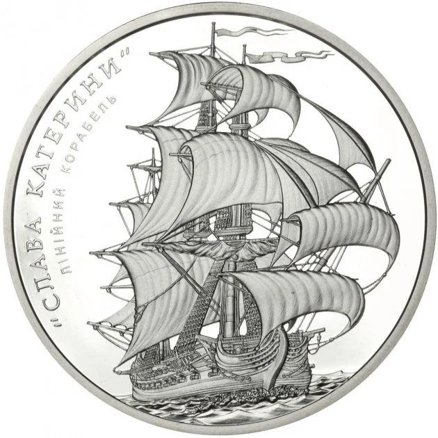 A ship under sail against a mirrored background. To the left, a semicircular inscription reads: "СЛАВА КАТЕРИНИ" / ЛІНІЙНИЙ КОРАБЕЛЬ.