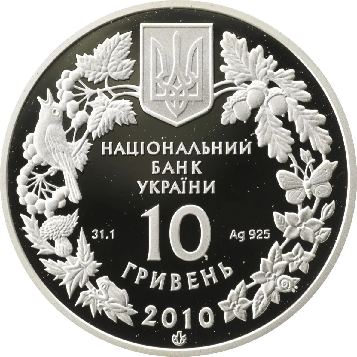 The Small Coat of Arms of Ukraine is centered within an ornamental wreath of flora and fauna. Surrounding legends read: НАЦІОНАЛЬНИЙ БАНК УКРАЇНИ, 10 ГРИВЕНЬ, 2010, along with the specifications Ag 925, 31.1 (weight in fineness), and the Mint's logo.