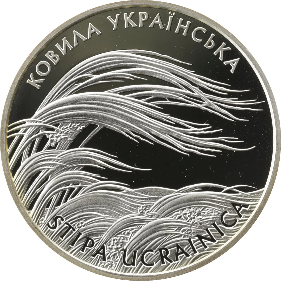 Feather grass with dual inscriptions: Ukrainian КОВИЛА УКРАЇНСЬКА above, Latin STIPA UCRAINICA below.