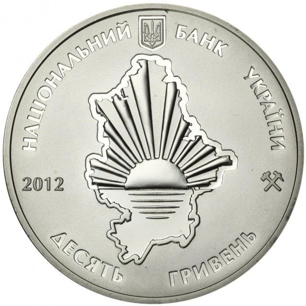 The obverse features Ukraine's Small Coat of Arms, the inscriptions "НАЦІОНАЛЬНИЙ БАНК УКРАЇНИ" and "ДЕСЯТЬ ГРИВЕНЬ", and the year 2012. The reverse shows a fragment of the Donetsk oblast flag superimposed on its outline map.