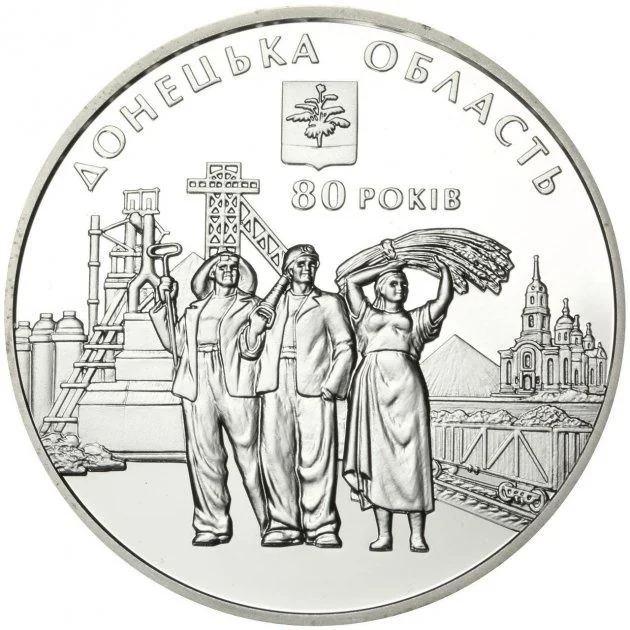 The design features a metallurgist, miner, and farm worker against an industrial landscape, with the Holy Transfiguration Cathedral of Donetsk to the right. Above is the semicircular inscription "ДОНЕЦЬКА ОБЛАСТЬ" (Donetsk Oblast) with the oblast coat of arms, and below it the legend "80 РОКІВ" (80 years).