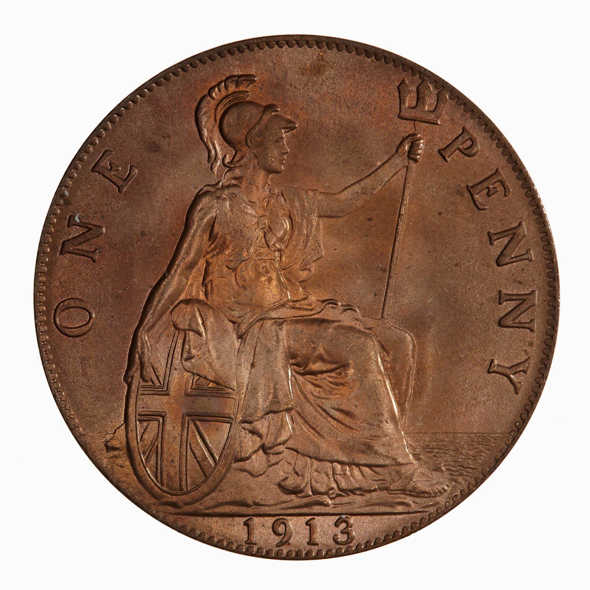 Britannia seated right, holding trident and Union Jack shield, with sea, denomination, and date.