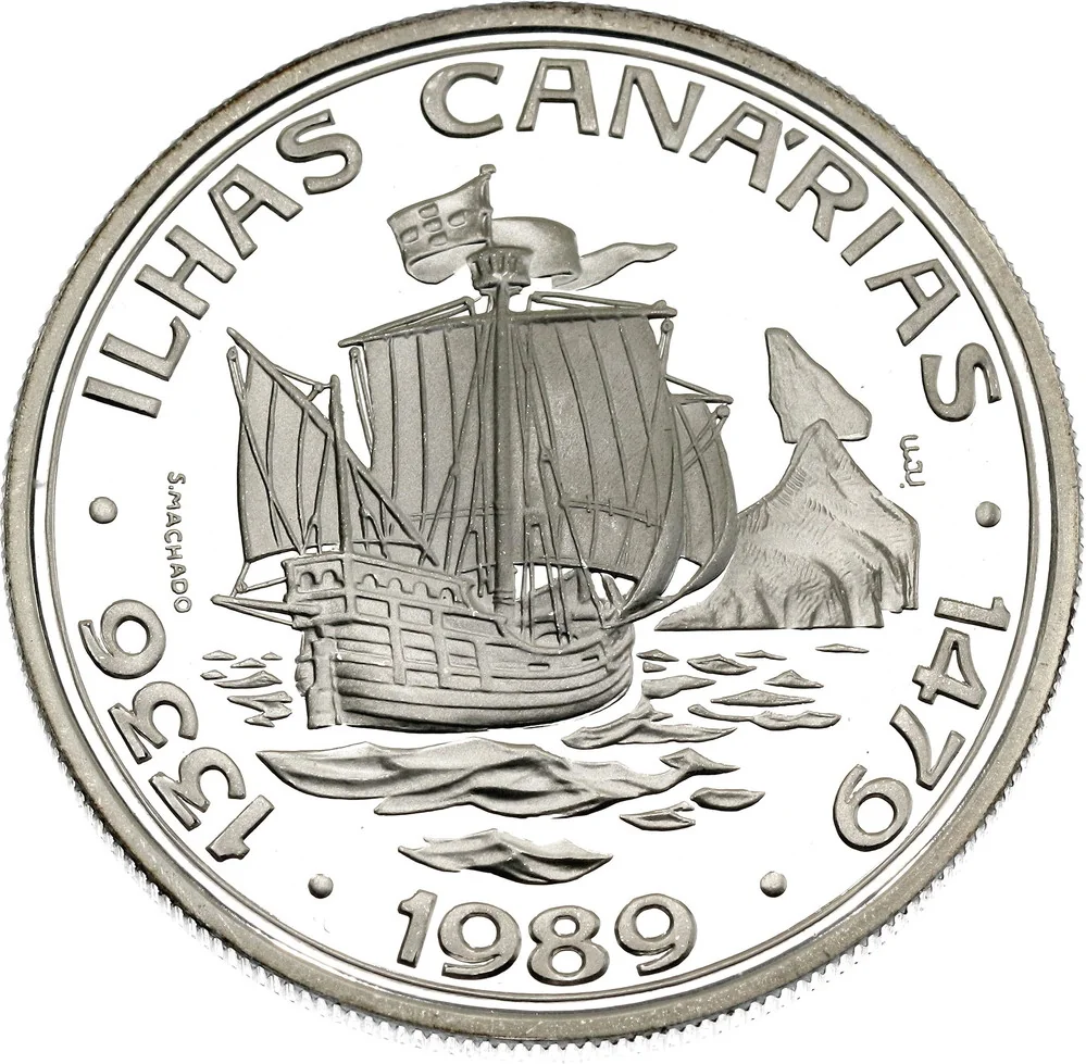Square-rigged caravel sailing before the Canary Islands. Left: date of Portuguese discovery. Right: date dispute ended and islands retroceded to Spain. Coin's date below.
