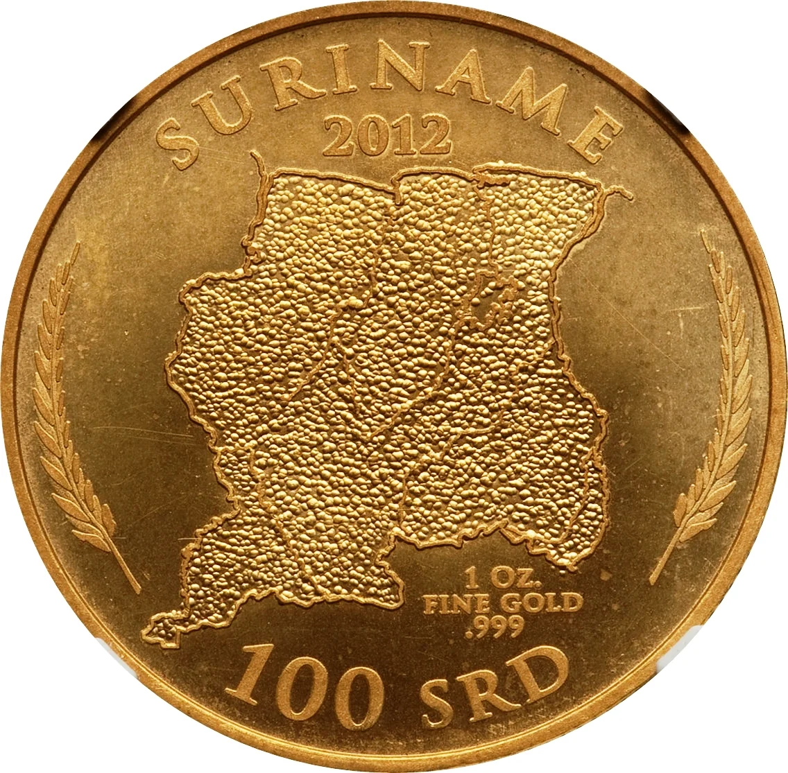 Suriname map between palm branches. Legend and year above; weight, purity, and denomination below.