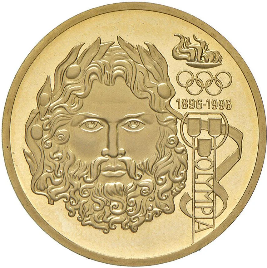 Zeus head left, Olympic logo and flame right.
