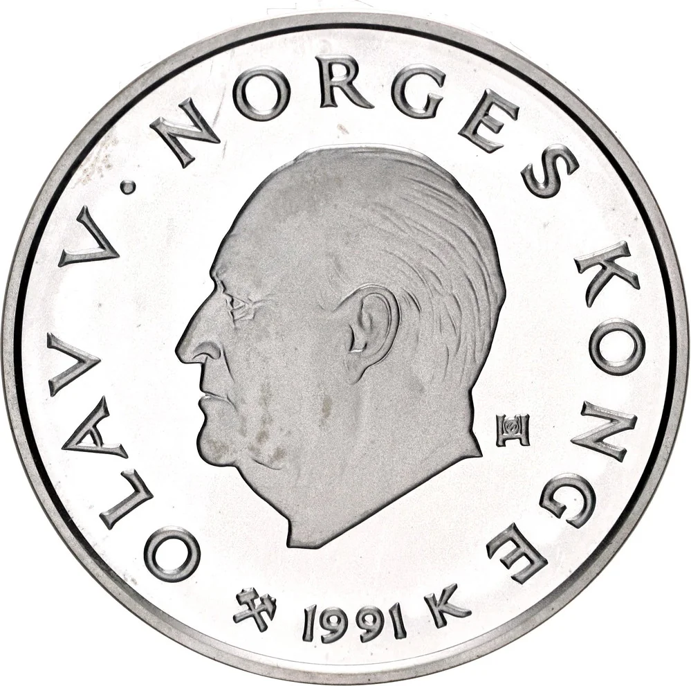 King Olav V left-facing bust. Engraver's initials behind head. Inscription surrounds. Mintmark, date, and mintmaster initial below. Solid rim ring.