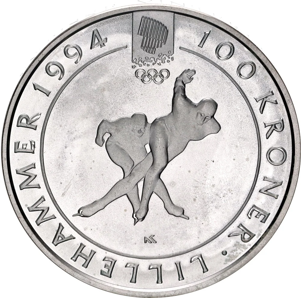 Two speed skaters facing forward, slightly right. Designer's initials below. All within a solid ring, broken at the top by the Olympic logo. Surrounded by value and inscription. Solid ring on the rim.