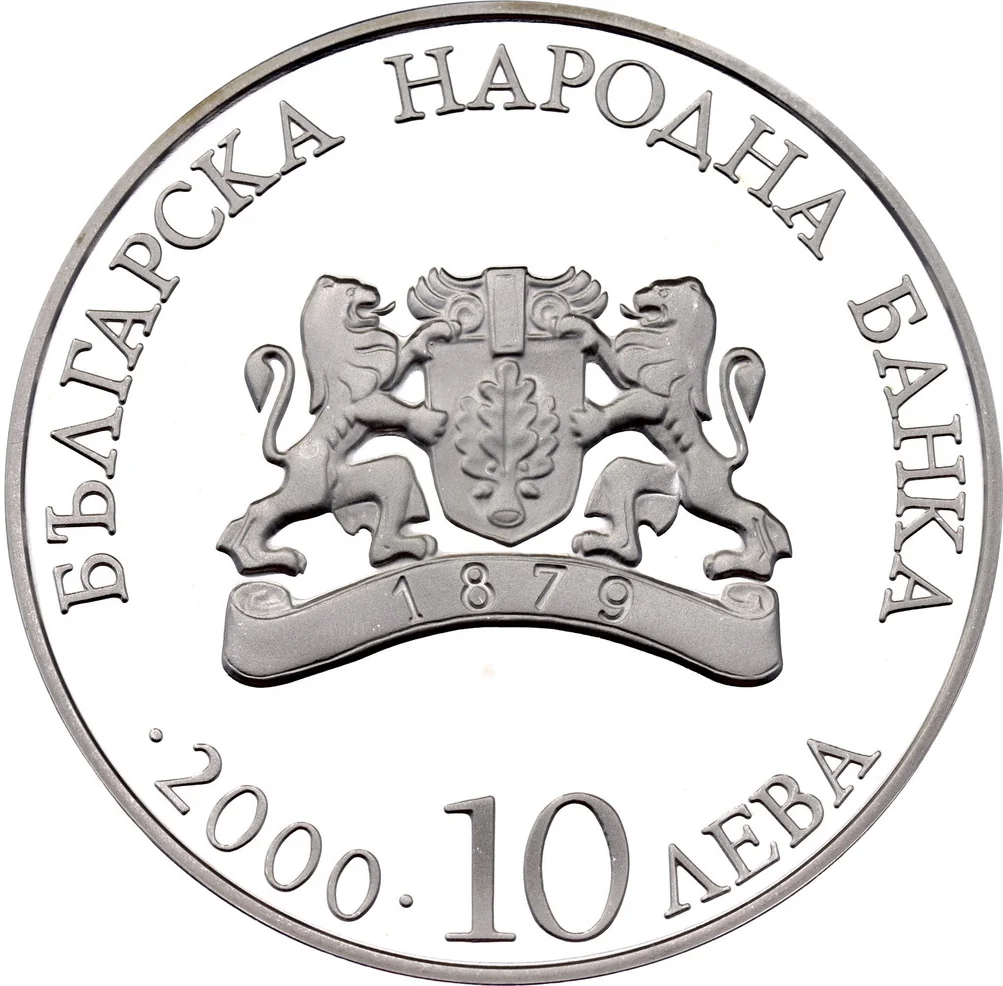 The obverse bears the Bulgarian National Bank logo with "1879" on its ribbon, encircled by "БЪЛГАРСКА НАРОДНА БАНКА," "10 ЛЕВА," and the issue year.