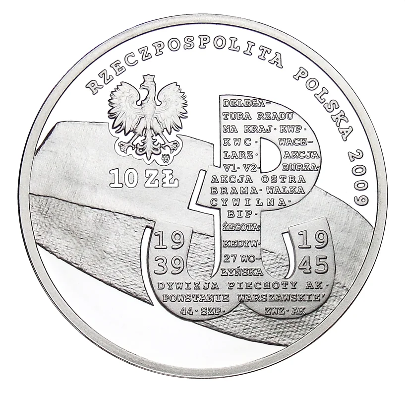 Top left: Poland's Eagle emblem. Below it, against a stylized insurgent armband, the Fighting Poland symbol. Mint mark M/W under the Eagle's left leg.