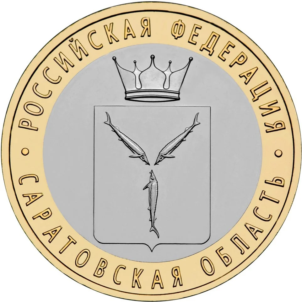 The emblem of the Saratov Region on a disc, encircled by the inscriptions "РОССИЙСКАЯ ФЕДЕРАЦИЯ" above and "САРАТОВСКАЯ ОБЛАСТЬ" below.