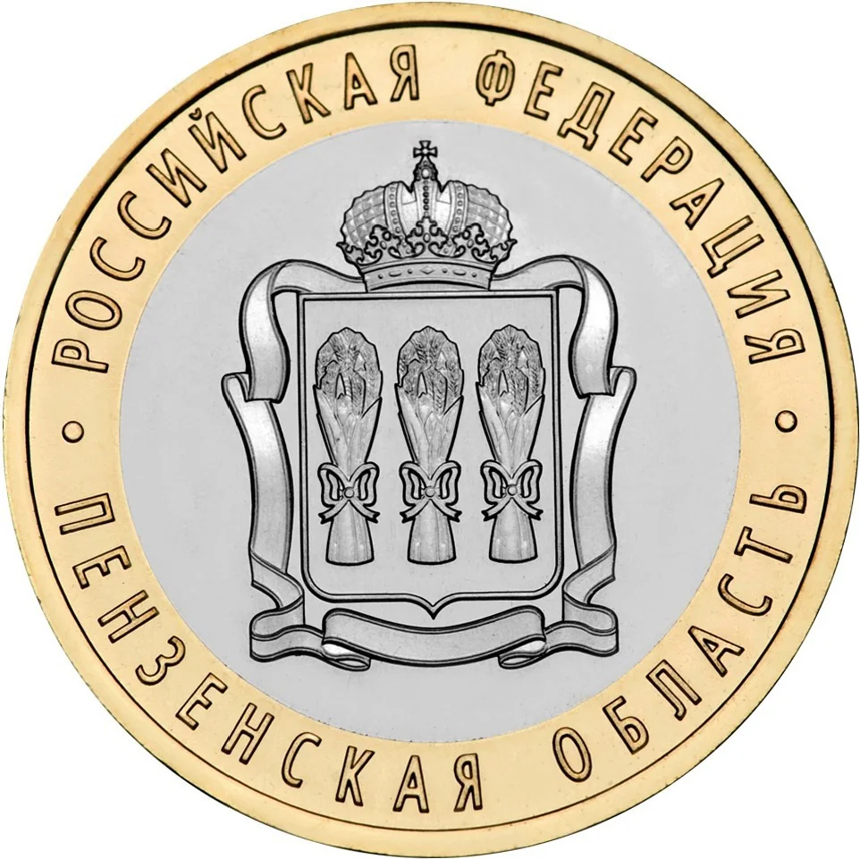 The emblem of the Penza Region on a disc, encircled by the inscriptions "РОССИЙСКАЯ ФЕДЕРАЦИЯ" above and "ПЕНЗЕНСКАЯ ОБЛАСТЬ" below.