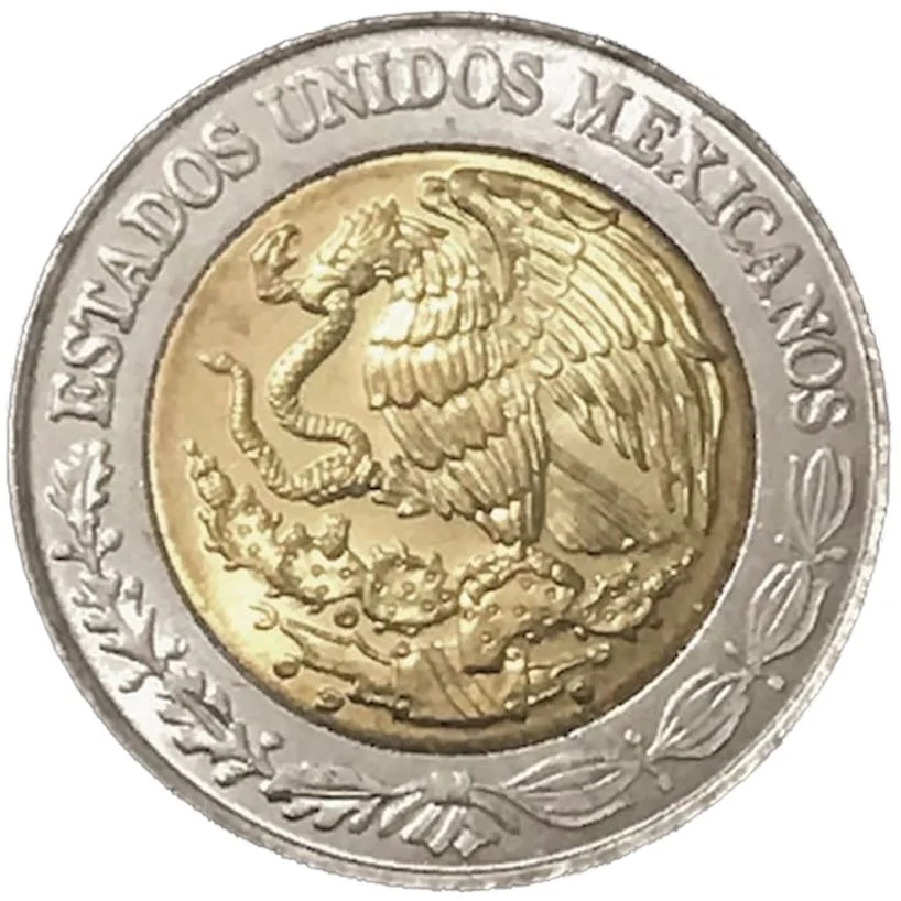 Mexico's emblem: a golden eagle on a cactus, eating a snake above an oak and laurel wreath, encircled by "ESTADOS UNIDOS MEXICANOS."
