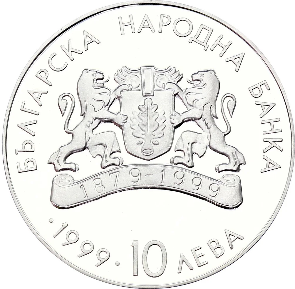 The obverse bears the Bulgarian National Bank logo with "1879" on its ribbon, encircled by "БЪЛГАРСКА НАРОДНА БАНКА," "10 ЛЕВА," and the issue year.