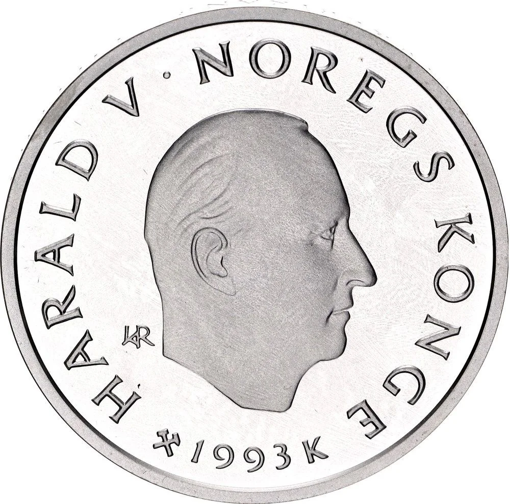 King Harald V facing right, engraver's initials behind bust. Inscription surrounds. Mintmark, date, and mintmaster's initial below. Solid rim ring.