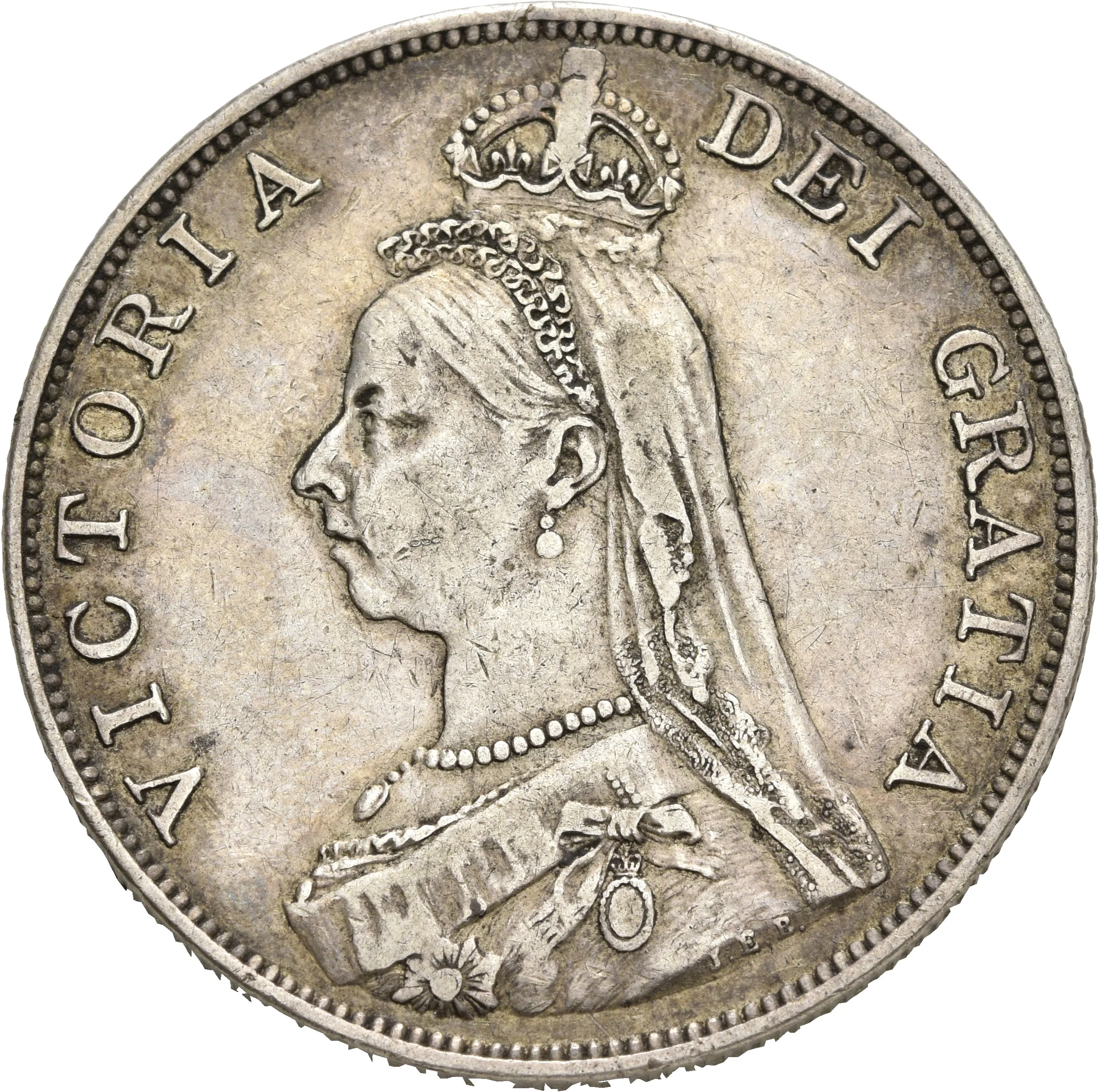 Veiled left-facing bust of Queen Victoria, crowned, with surrounding legend.