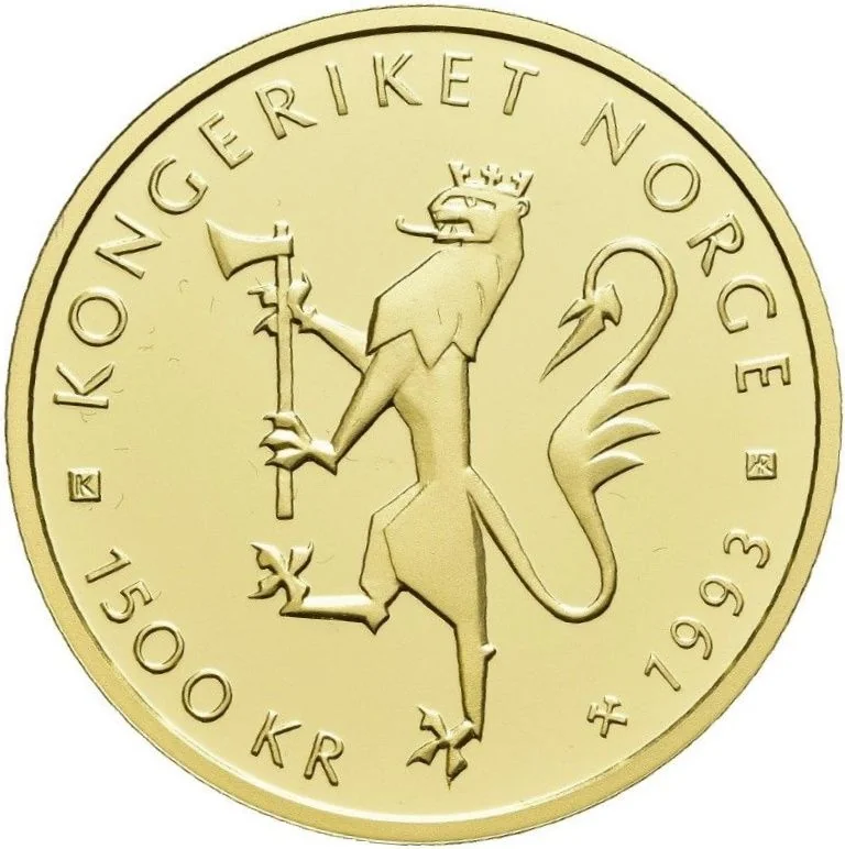 Norwegian lion with crown, facing left and holding a halberd. Inscription above. Value and mintmaster initial at lower left; date, mintmark, and engraver initial at lower right. Solid rim ring.