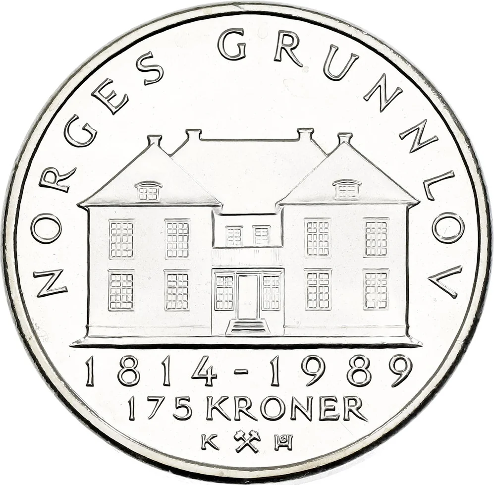 Eidsvollsbygningen, the historic manor where Norway's Constitution was signed on 17 May 1814. Inscription surrounds the building, with dates, value, and minting details below. Solid ring on the rim.