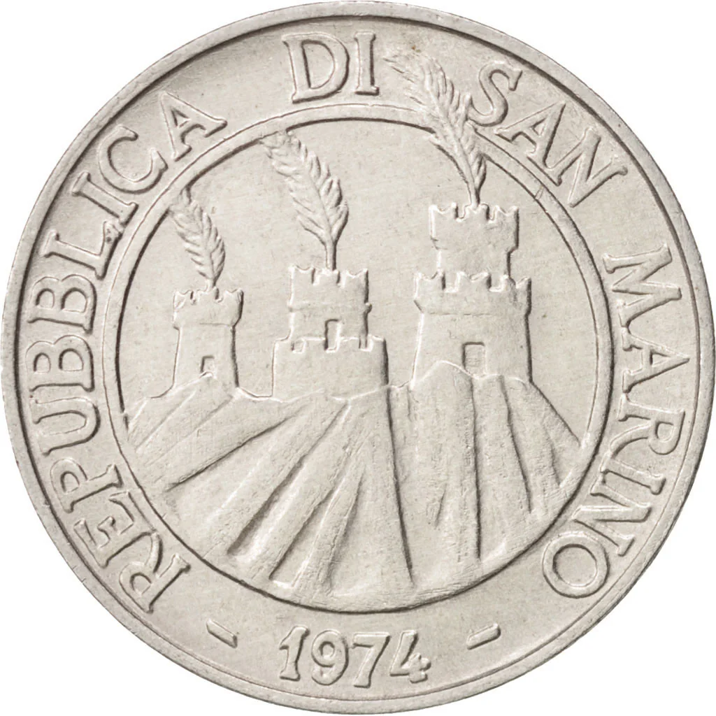 In 1974, San Marino’s currency situation was fundamentally defined by its close economic and monetary integration with Italy, governed by a series of bilateral treaties. The most important of these was the Convention of 1939, which established the Italian Lira as legal tender within the republic and granted San Marino limited rights to mint its own coinage. These Sammarinese coins, denominated in lire, were legally equivalent to their Italian counterparts and circulated interchangeably, but they were produced in strictly limited quantities, primarily for commemorative and collector purposes rather than for driving the domestic economy. The country had no central bank and did not issue paper currency, relying entirely on Italy for its circulating medium.