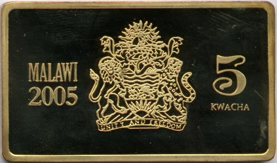 Malawi's coat of arms is centered, with the country name above, the date to the left, and the denomination to the right.