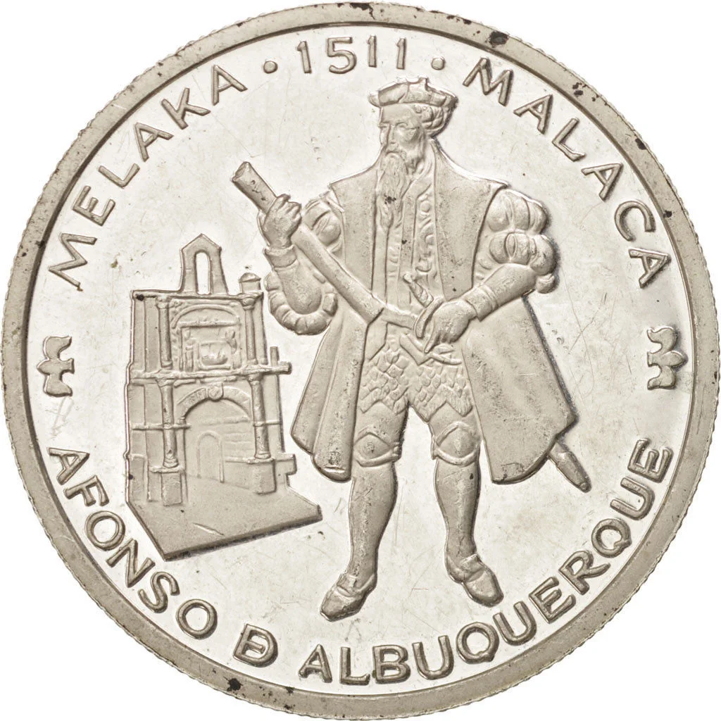 Portrait of Afonso de Albuquerque, conqueror of Malacca in 1511, before the ruins of the Porta de Santiago fortress he built.