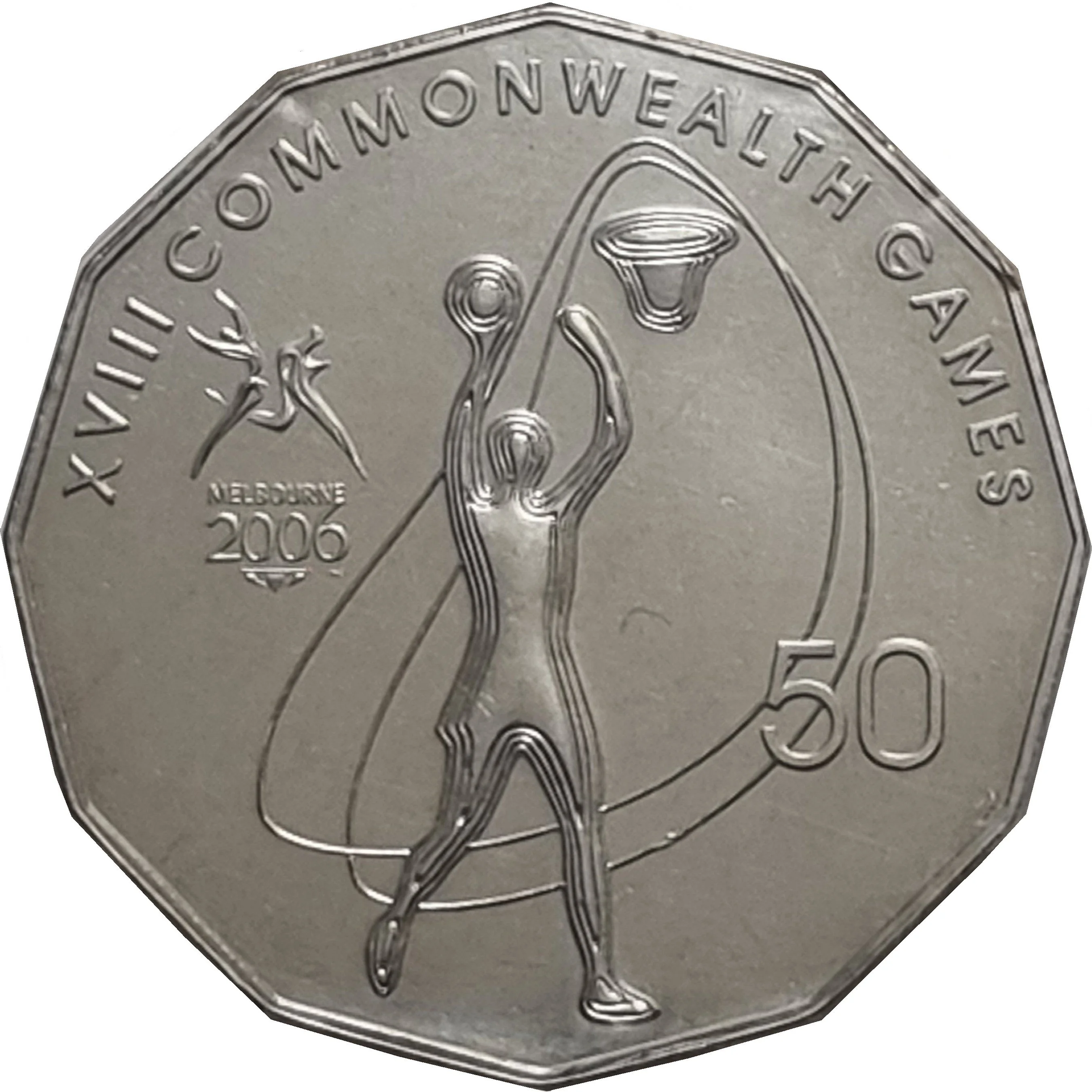 Netball player figure with Melbourne 2006 logo.