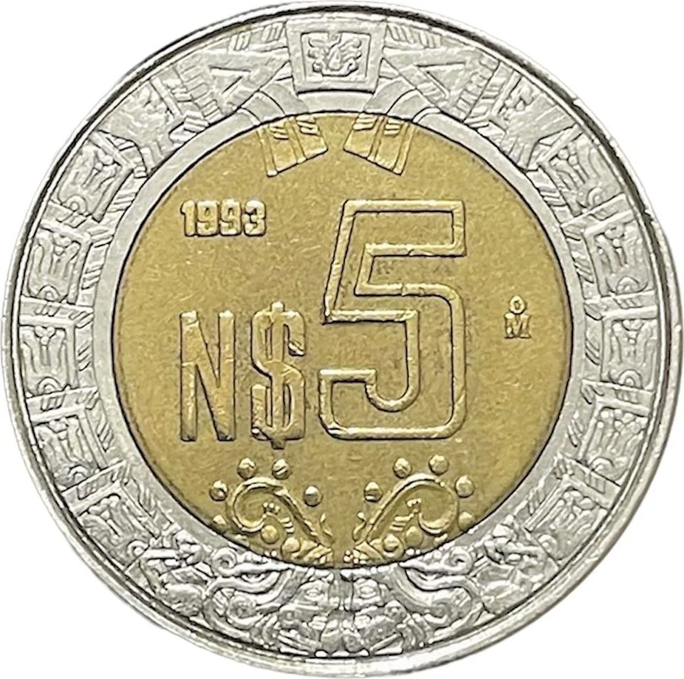 Central denomination with date above, mint mark right, surrounded by Ring of Splendor designs from the Aztec Sun Stone.