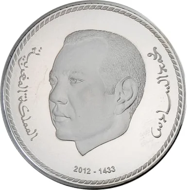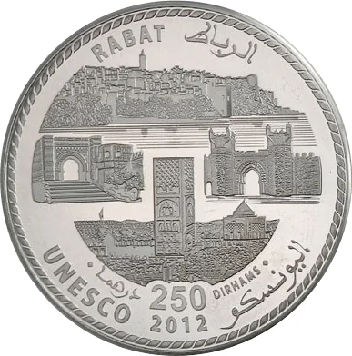 Description: Three monuments on 100 dirham coins: Hassan Tower, Chellah Door, and Kasbah of the Udayas. Above, a Rabat panorama; below, the value.