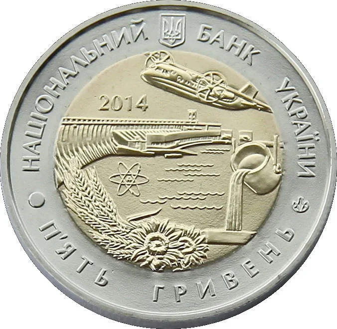Featuring Ukraine's Small Coat of Arms above, the coin's design centers on the DniproHES dam, a catalyst for the region's industrial growth. The 2014 issue year appears above the dam, flanked by symbols of local industry: an airplane (motor industry), a steel ladle (metallurgy), sunflower and wheat (agriculture), and an atom emblem (nuclear power). The Bank of Ukraine inscription and value are below, with the National Bank Mint mark to the right.