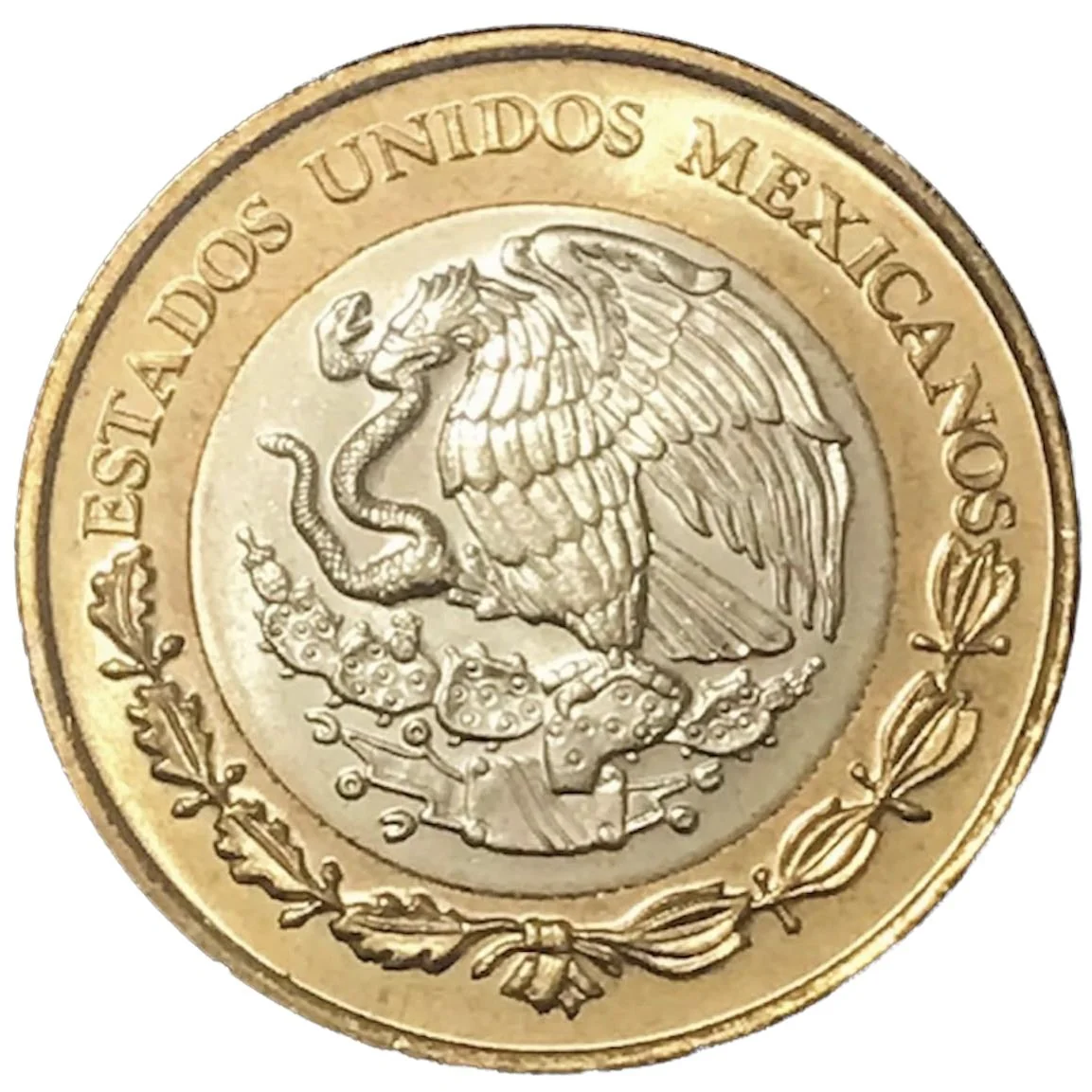 Mexican national arms (eagle on cactus, facing left, holding a snake) above a wreath, with a semicircular inscription above.