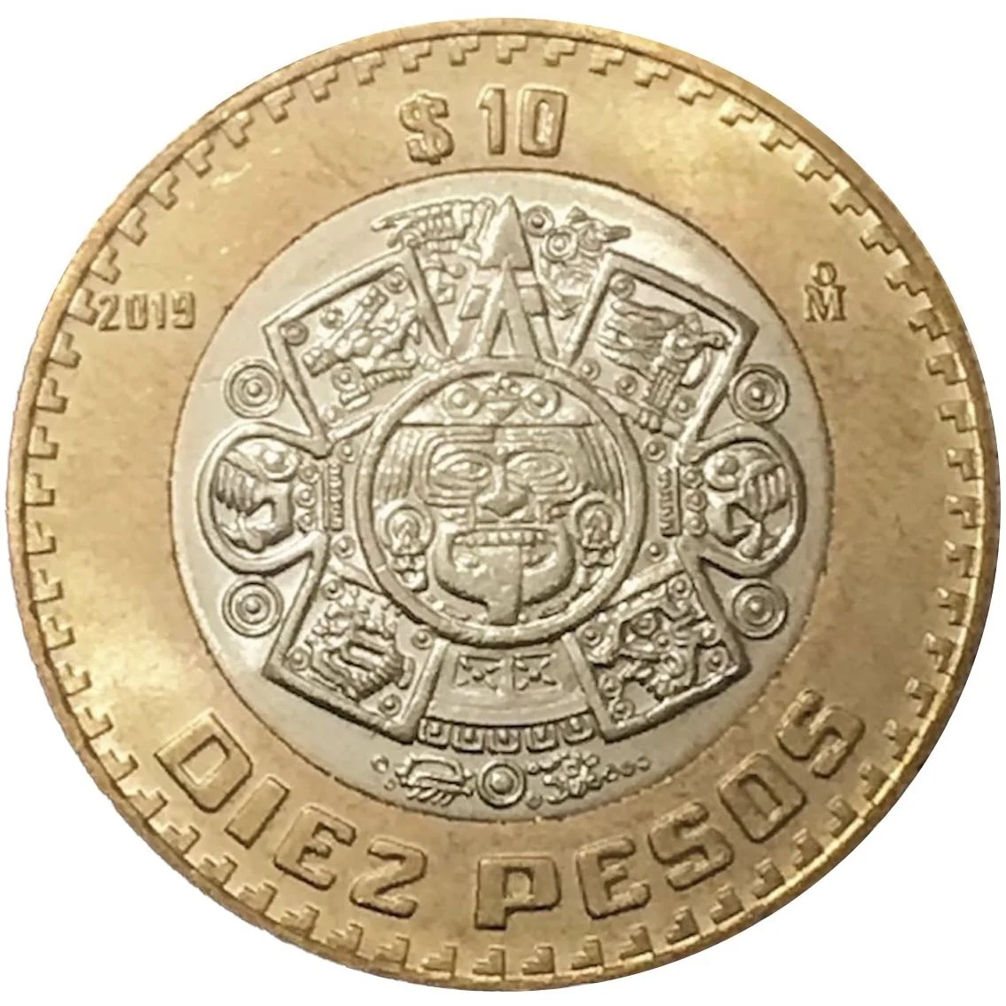 Central Aztec sun stone circle depicts Tonatiuh with a fire mask. Peripheral ring: top has value, left has mint year, right has Mexico Mint mark "Mo", bottom has face value in words. Most coins feature an inverted "L" ornament along the rim.