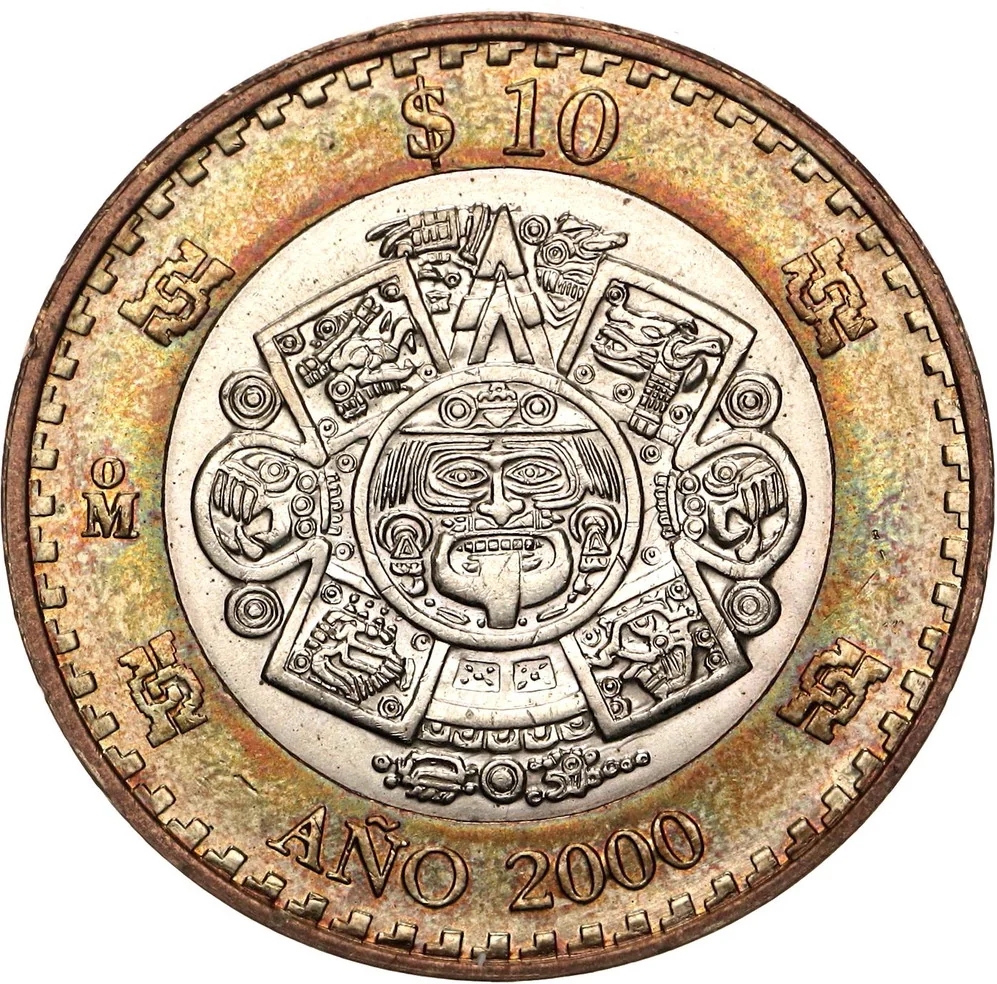 Center: Sun Stone circle with Tonatiuh's fire mask. Outer ring: top "$10", left mint year, right Mexico Mint "M", bottom date. Smooth frame with uneven edge.