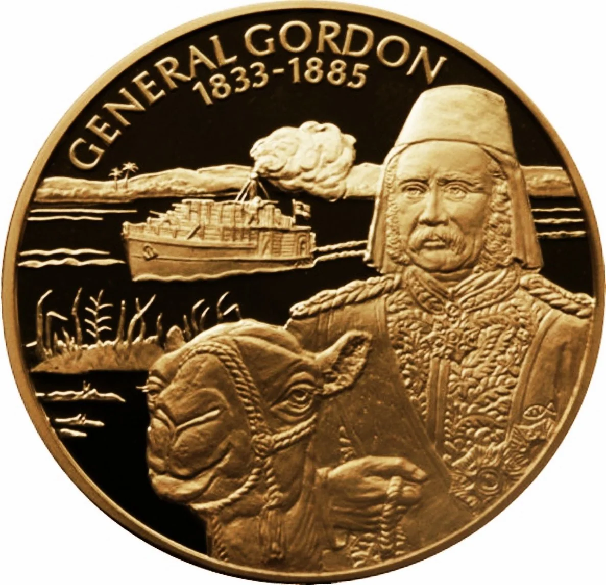 General Charles George Gordon on a camel, a steamer behind.