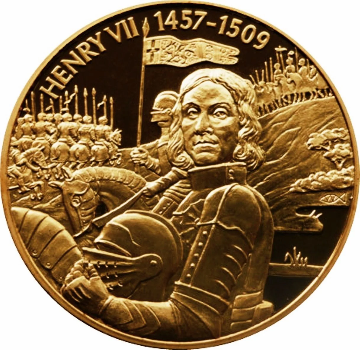 King Henry VII on horseback, helmet in hand, with his troops behind him.