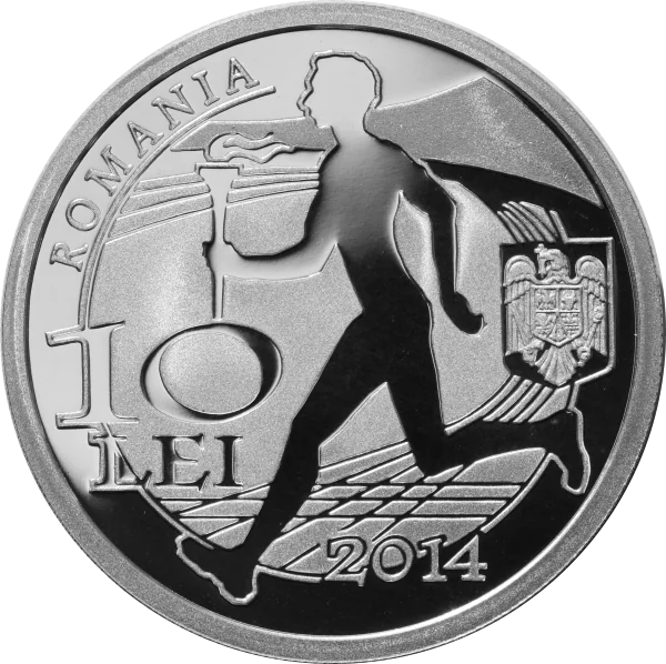 Olympic-themed 10 LEI coin, featuring Romania's coat of arms, the year 2014, and the inscription "ROMANIA".