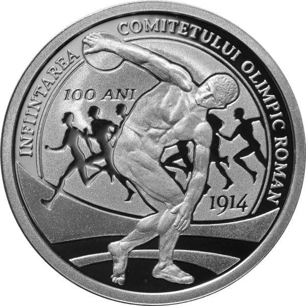 Sports composition with "100 ANI", "1914", and the arch inscription "INFIINTAREA COMITETULUI OLIMPIC ROMAN".