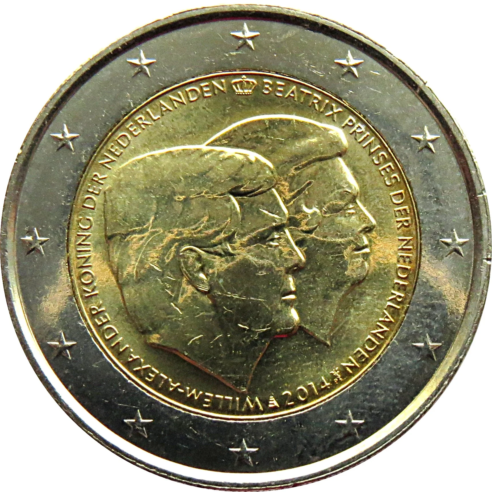 The inner part features the effigies of King Willem-Alexander and former Queen Beatrix. Flanking them are semi-circular inscriptions: ‘WILLEM-ALEXANDER KONING DER NEDERLANDEN’ on the left and ‘BEATRIX PRINSES DER NEDERLANDEN’ on the right. Between these, the top shows the crown symbol and the bottom displays the mint master mark, mint mark, and the year ‘2014’. The outer ring bears the 12 stars of the European Union.