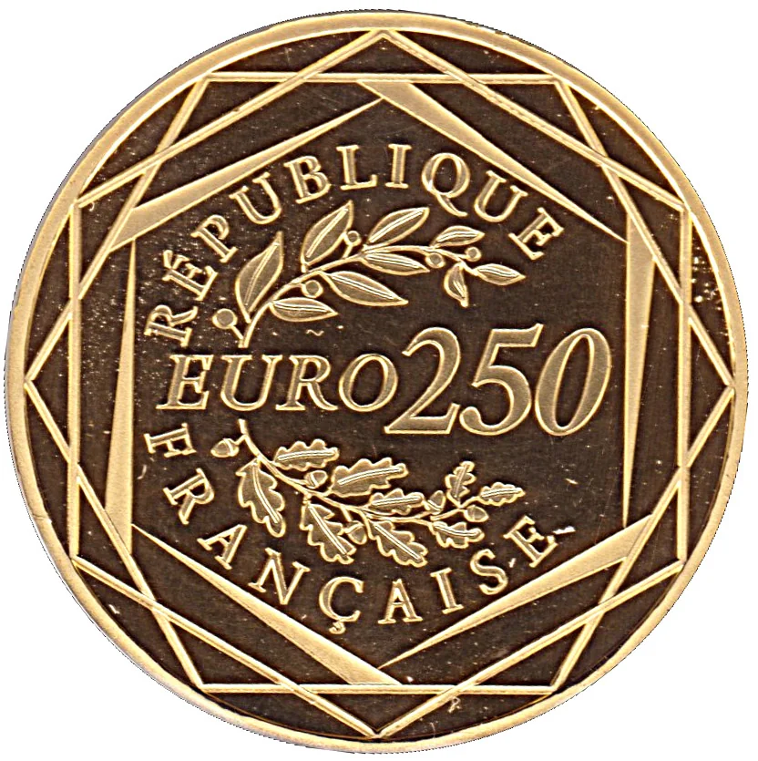 The face value, flanked by oak and laurel branches, is framed by lines forming the Hexagon.