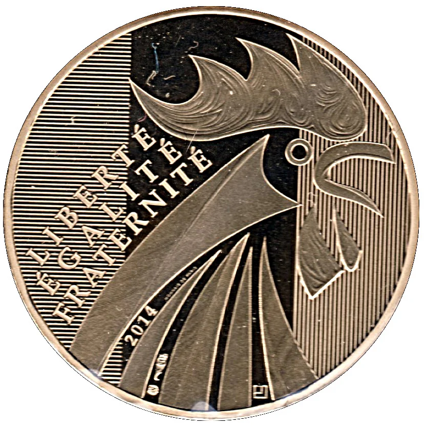 A contemporary cockerel bust with stylized crest and feathers, bearing the motto "Liberté, Égalité, Fraternité". The French flag in the background uses the heraldic patterns from euro coins: horizontal lines (blue), flat (white), and vertical lines (red).