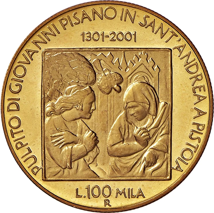 Inside a square frame is the "Annunciation" panel from the pulpit. Above are the anniversary dates; below, the value and mint mark.