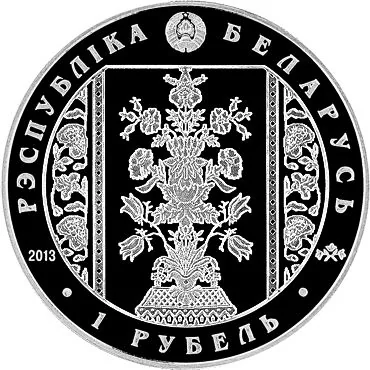 Reverse: Depicts a fragment of a Slutsk manufactory belt (1780–1807) from the National Museum. Inscriptions: "РЭСПУБЛІКА БЕЛАРУСЬ", year of issue, artistic element, and "1 РУБЕЛЬ".