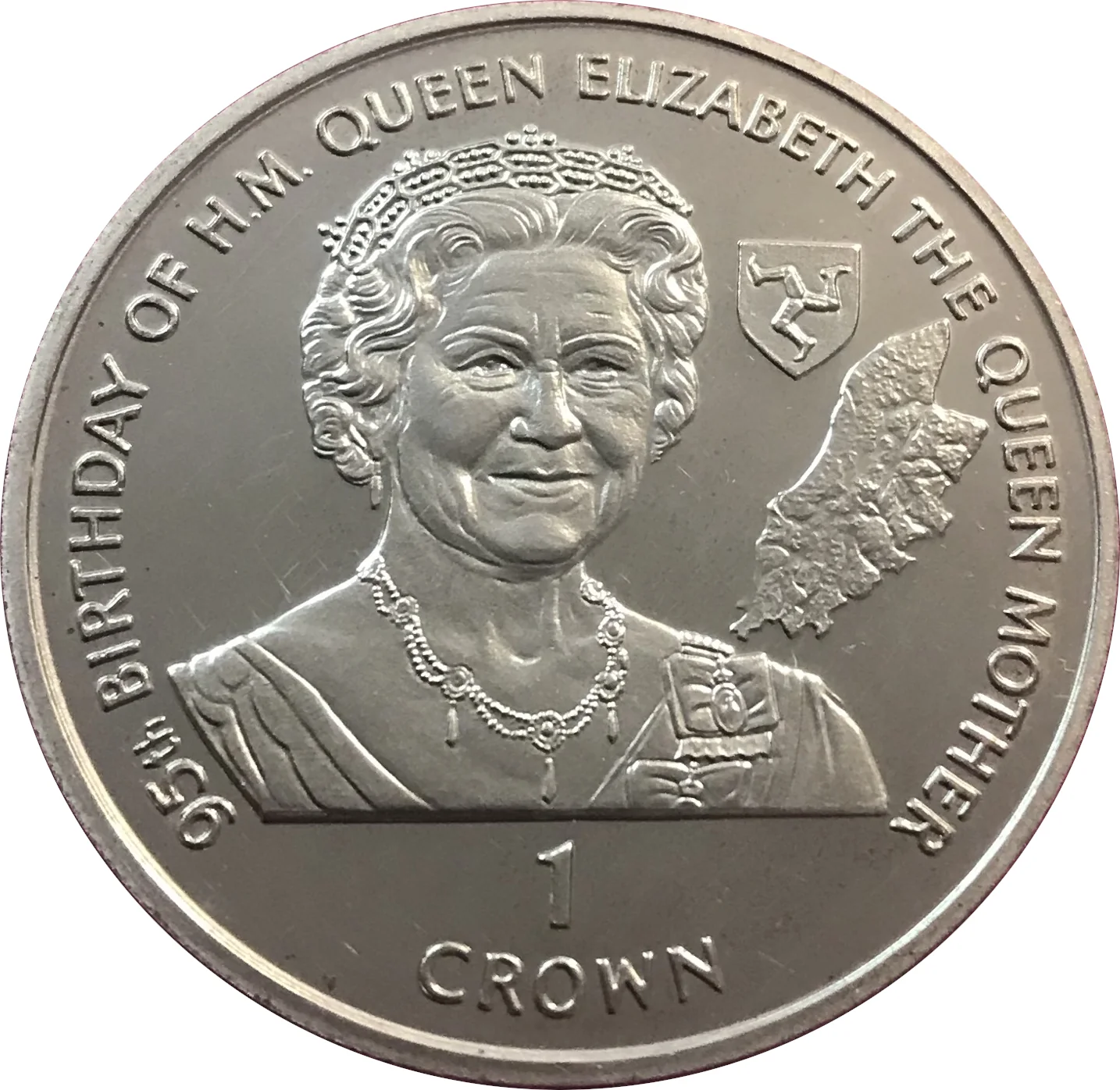Bust of Queen Mother, triskelion over Isle of Man map, legend around, denomination below.