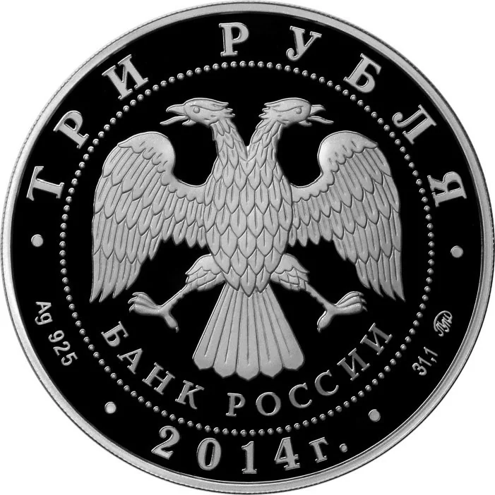 Central: Bank of Russia emblem within a dotted circle. Rim inscriptions: top – "THREE ROUBLES"; bottom left – metal and fineness, centre – "2014", right – metal content and mint mark.