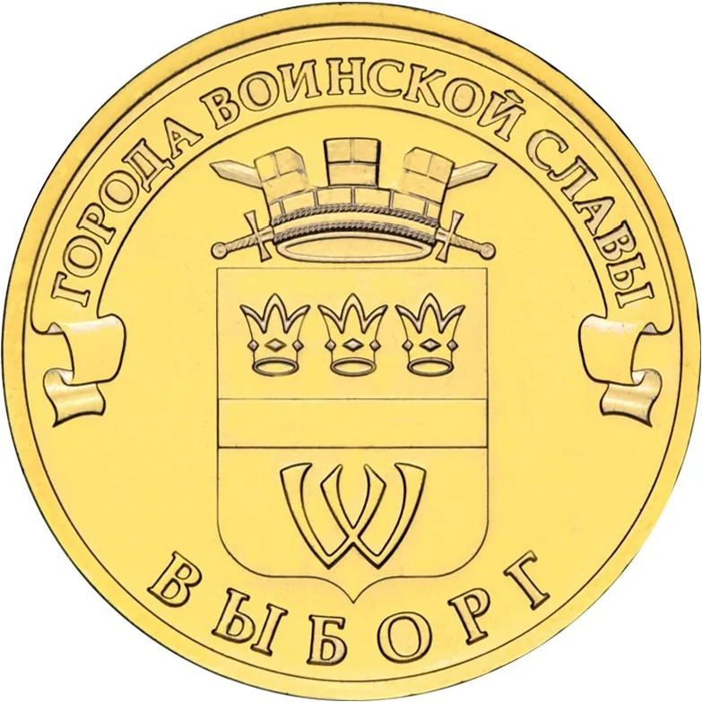 The reverse features the Vyborg emblem, encircled by the inscriptions "ГОРОДА ВОИНСКОЙ СЛАВЫ" above and "ВЫБОРГ" below.