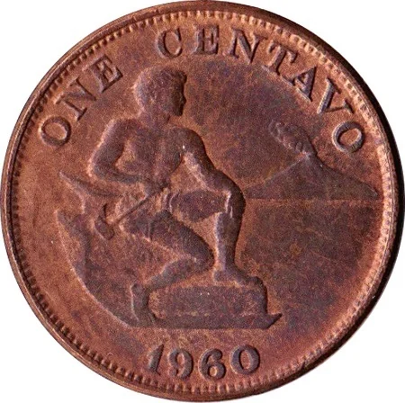 Seated man with hammer and anvil left, Mayon Volcano right.