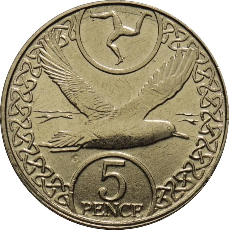 Manx triskelion over a flying shearwater, Celtic ring around value.