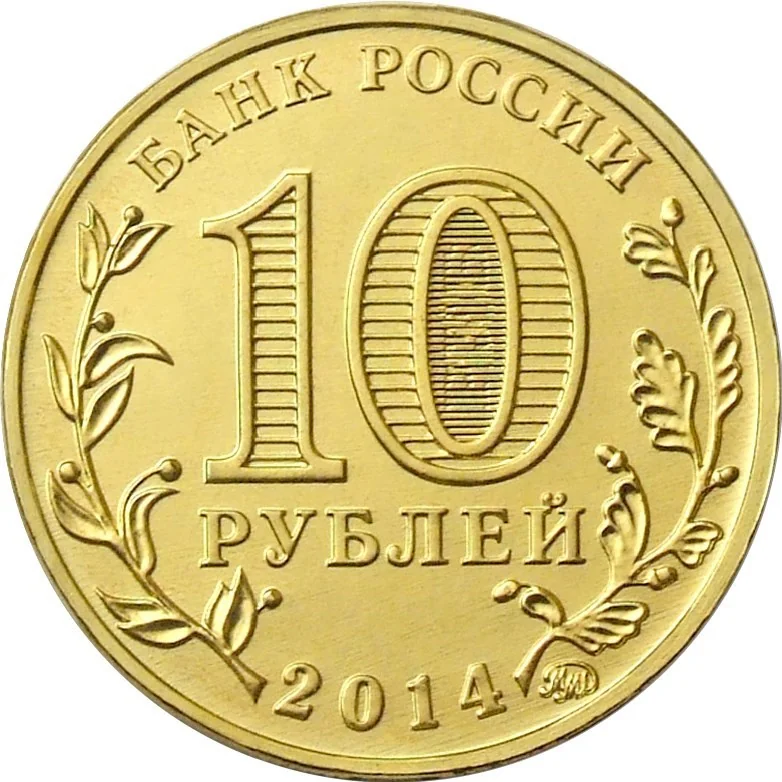 The upper rim reads "БАНК РОССИИ" (BANK OF RUSSIA), with the year "2014" below. Stylized laurel and oak twigs flank the center, which features the face value "10 РУБЛЕЙ" (10 ROUBLES). Inside the "0" is a hidden "10" and "РУБ" (RUB) visible at different angles. The mint mark is at the bottom.