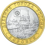 Borovsk town panorama with its coat of arms above. Rim inscriptions: "ДРЕВНИЕ ГОРОДА РОССИИ" (ANCIENT RUSSIAN TOWNS) on top, "БОРОВСК" (BOROVSK) below.