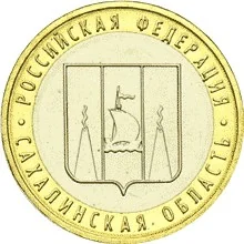 The coat of arms of the Sakhalin Region. The rim is inscribed "РОССИЙСКАЯ ФЕДЕРАЦИЯ" above and "САХАЛИНСКАЯ ОБЛАСТЬ" below.