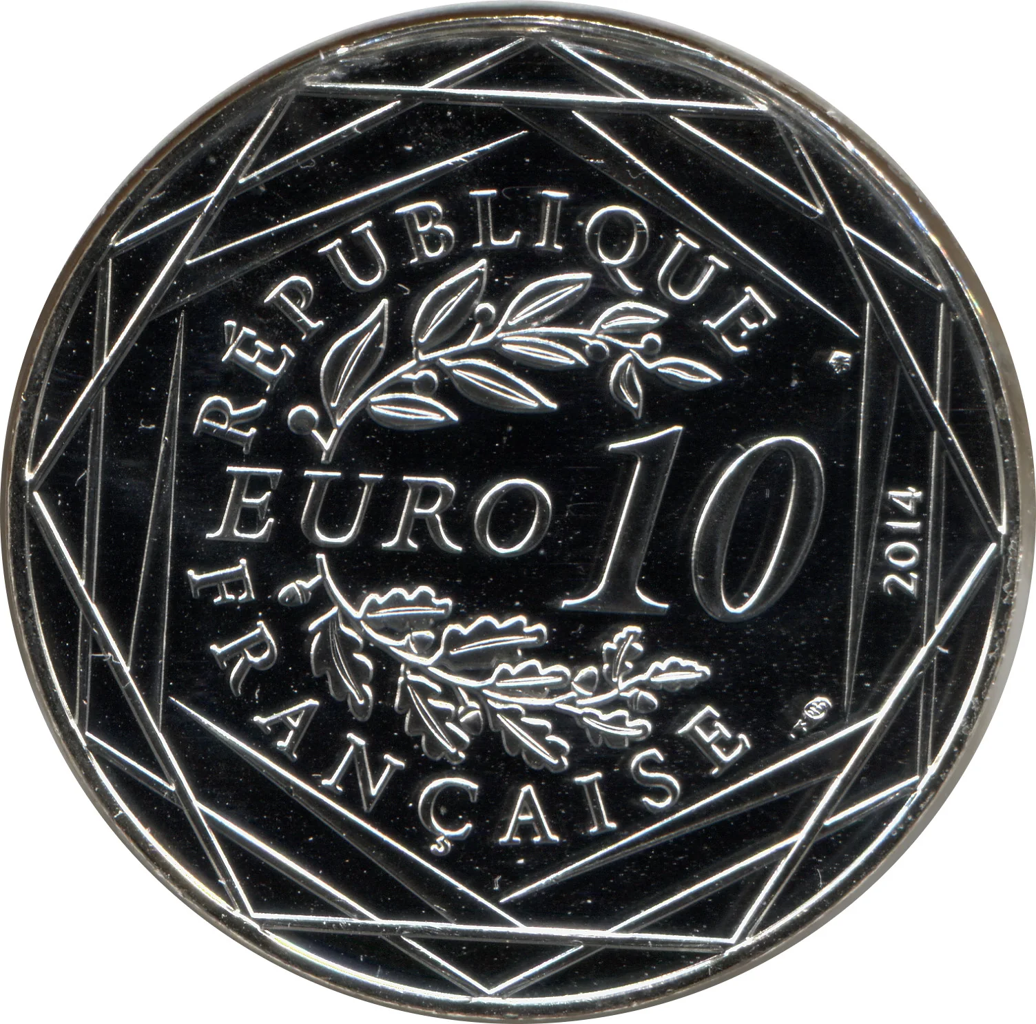 "10 EURO" flanked by laurel and oak branches, encircled by "RÉPUBLIQUE FRANÇAISE," three hexagons, and the issue year.