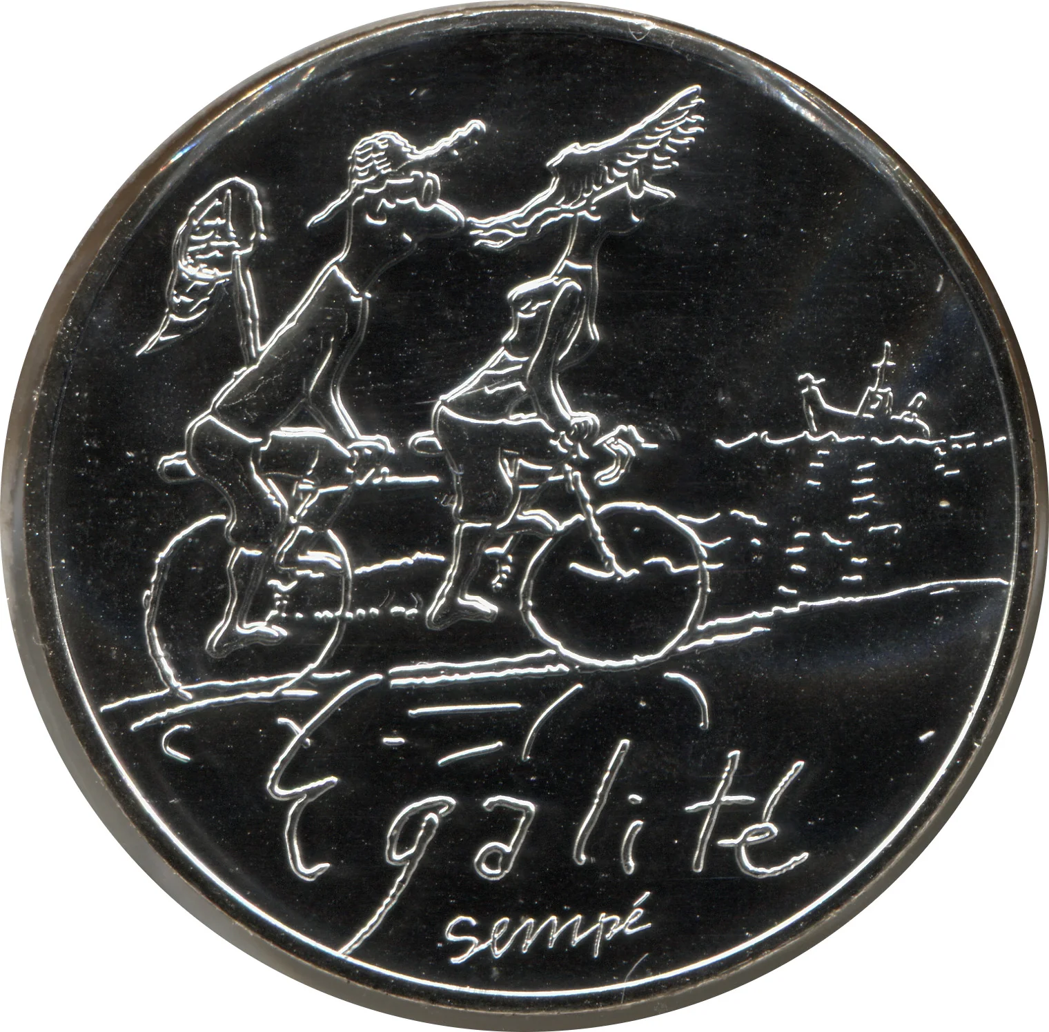 A 2014 Republic values poster by cartoonist Jean-Jacques Sempé, depicting a couple on a tandem bike with a distant boat.